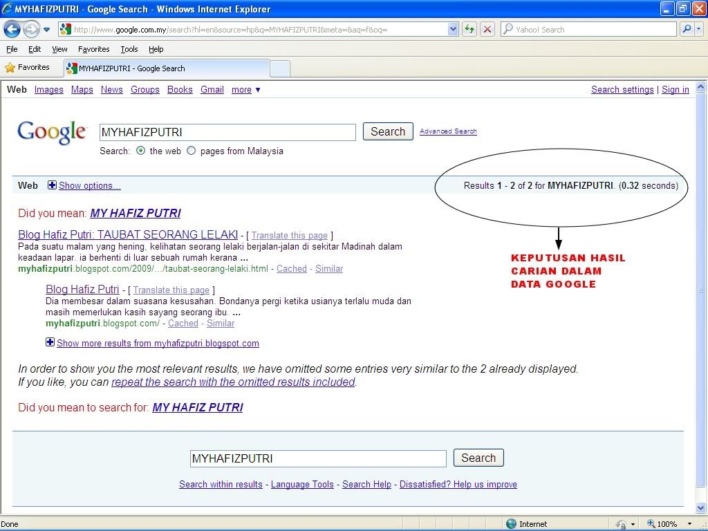 Untuk membina url blog, anda juga perlu memikirkan satu nama. Gunakanlah kreativiti anda untuk mencari satu nama unik yang akan mewakili blog anda. Kalau boleh anda bina satu nama unik yang belum pernah digunakan oleh mana-mana pelayar internet. Sebagai contoh melalui enjin carian google, anda boleh melihat pada bahagian result untuk menentukan berapa ramai pesaing untuk akses ke blog anda melalui nama yang akan anda berikan pada blog tersebut. Sebagai contoh di bawah ini ditunjukkan hasil carian untuk nama “myhafizputri” di dalam enjin carian google untuk melihat betapa uniknya nama “myhafizputri” yang telah dipilih.
